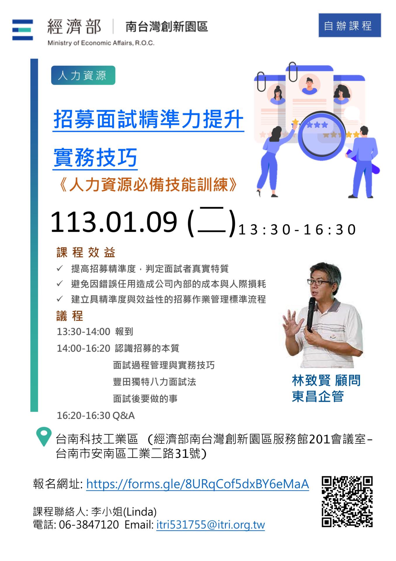 轉知工研院於2024年01月09日(二)假創新園區舉辦「招募面試精準力提升實務技巧」人才培訓課程,詳情如下,請參閱,歡迎有興趣的會員朋友踴躍報名參加,感謝您。