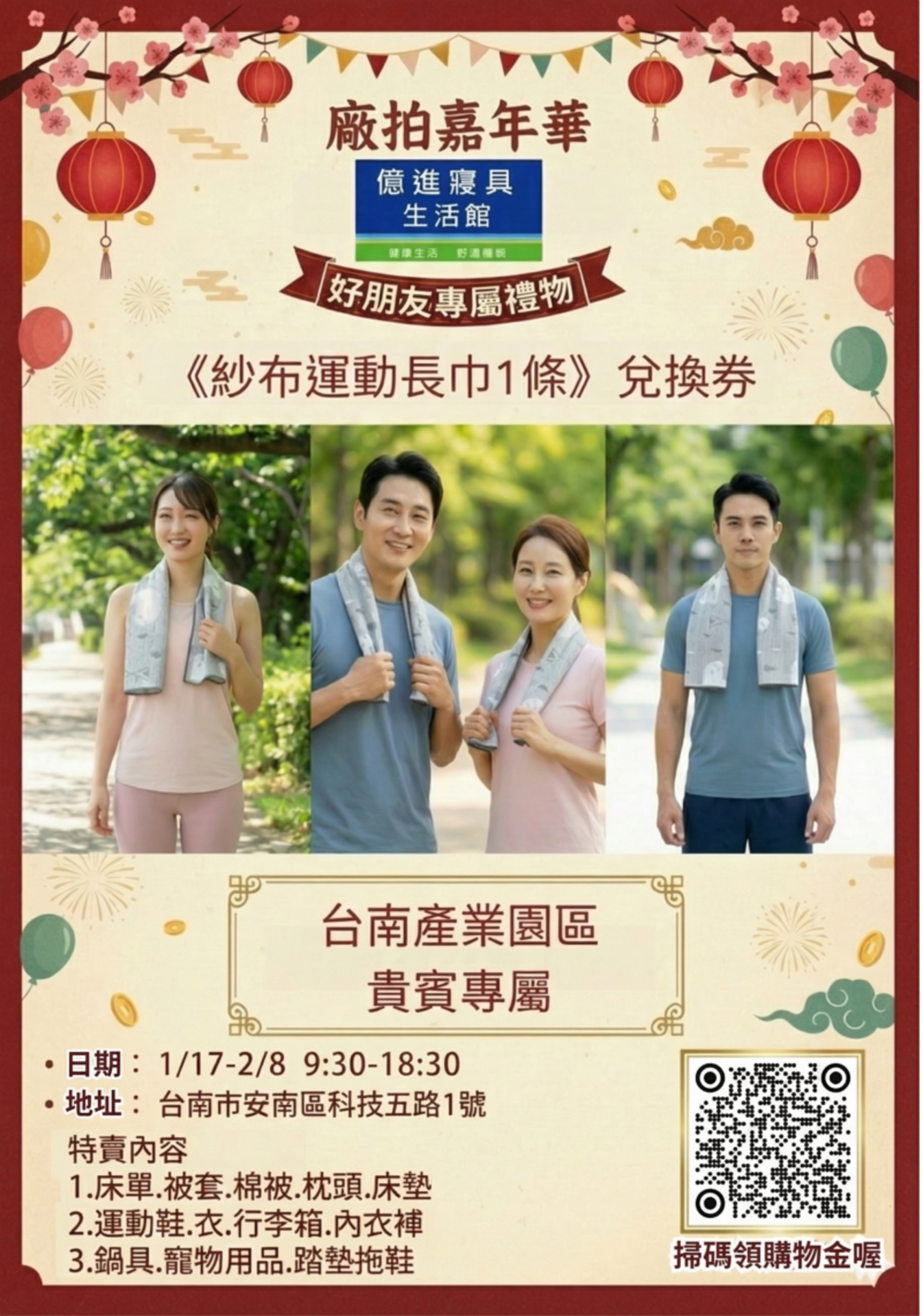 【廠協會好康通知】:億進寢具聯合廠拍廠拍2026.01.17~2026.02.08 憑台南產業園區專屬優惠優惠券,消費就可<兌領紗布運動長巾 1 條>數量有限,送完為止喔!