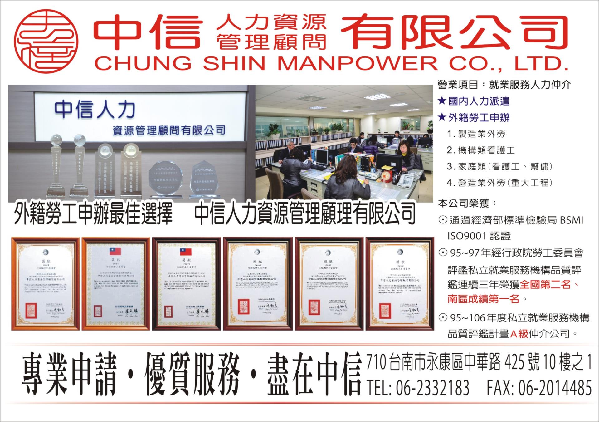 ⊙95~97年經行政院勞工委員會評鑑私立就業服務機構品質評鑑連續三年榮獲全國第二名、南區成績第一名