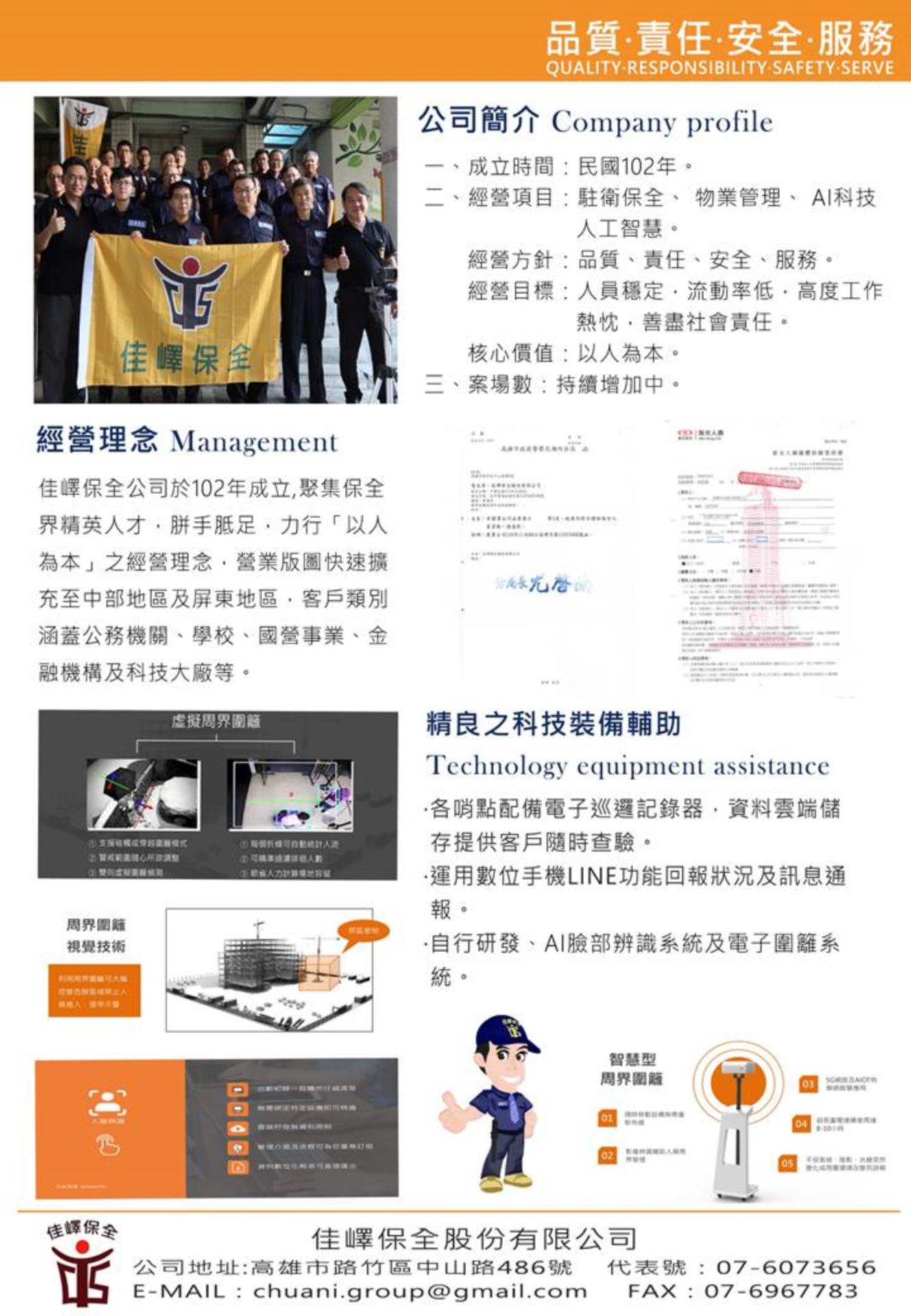 佳保全公司於102年成立,聚集保全界精英人才,胼手胝足,力行「以人為本」之經營理念,營業版圈快速擴充至中部地區及屏東地區,客戶類別涵蓋公務機關、學校、國營事業、金融機構及科技大廠等。