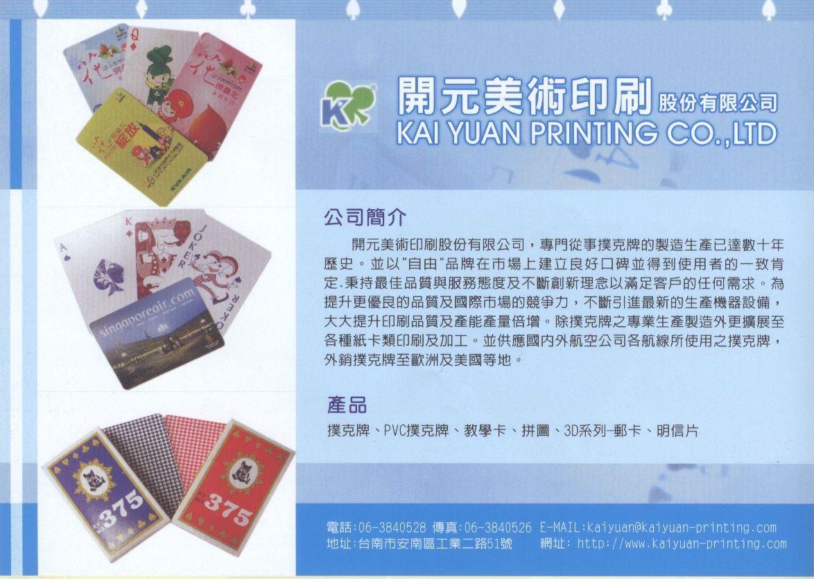 開元美術印刷股份有限公司,專門從事撲克牌的製造生產已達數十年歷史。並以"自由"品牌在市場上建立良好口碑並得到使用者的一致肯定.秉持最佳品質與服務態度及不斷創新理念以滿足客戶的任何需求。為提升更優良的品質及國際市場的競爭力,不斷引進最新的生產機器設備,大大提升印刷品質及產能產量倍增。除撲克牌之專業生產製造外更擴展至各種紙卡類印刷及加工。
