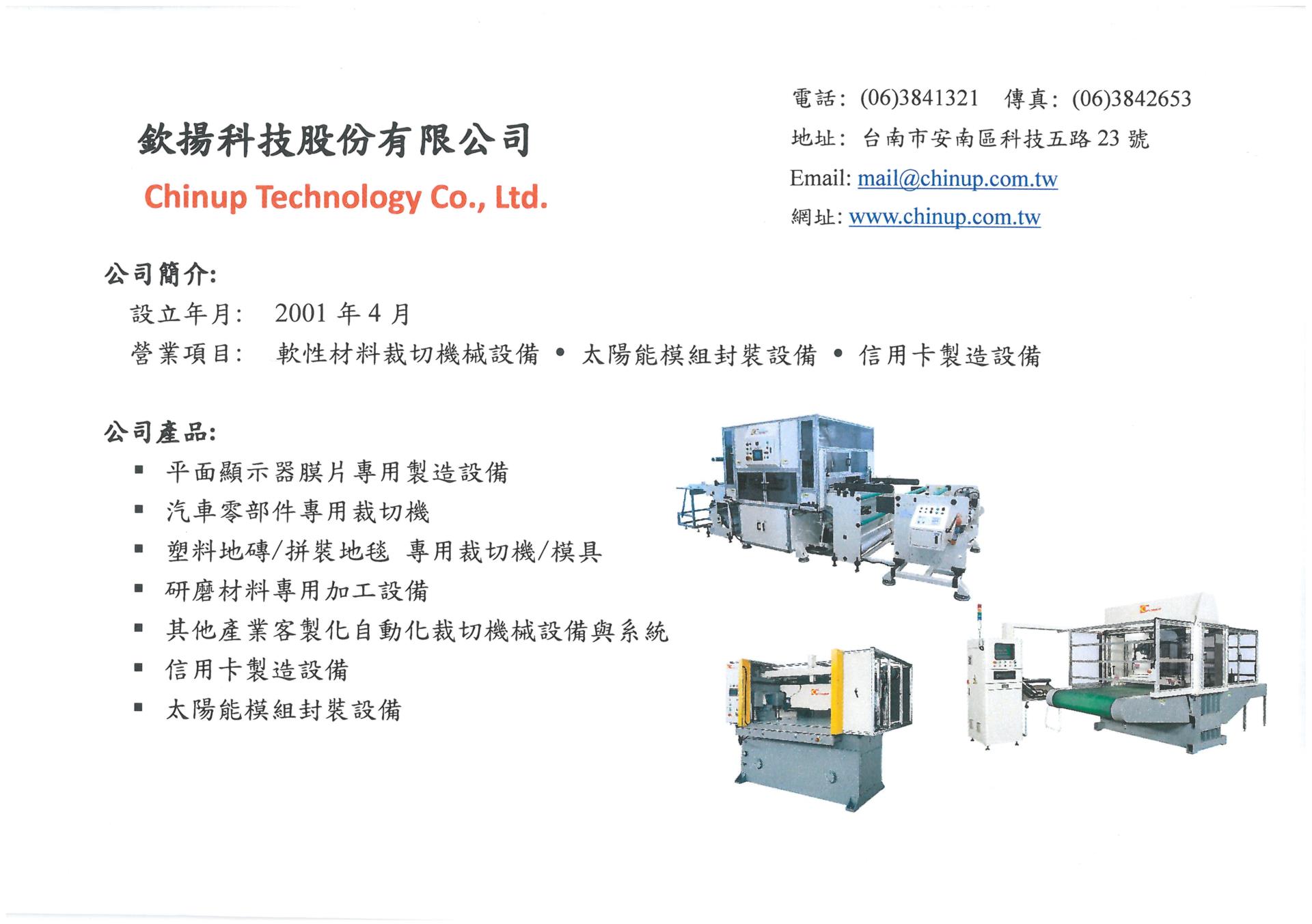 欽揚科技所生產之裁切設備目前已通過國內外數百家企業,超過千位以上工程師驗證,跨足多項專業領域,例如光電、太陽能、汽車、地面鋪設材料、研磨材料(砂紙)、包裝材料、印刷後加工材料、不織布、皮革、紡織、軟木、不乾膠製品…等產品應用。對於產品設計及品質要求,我們採取最嚴謹的態度,追求卓越,為客戶創造價值,建立優良信譽及口碑。主要生產線包刮:油壓裁斷機系列、分條復捲機、切片機、自動貼膠機、大型的汽車內裝裁斷機、PVC塑膠地板專用裁切機、卡片加工設備、太陽能模組製造設備。