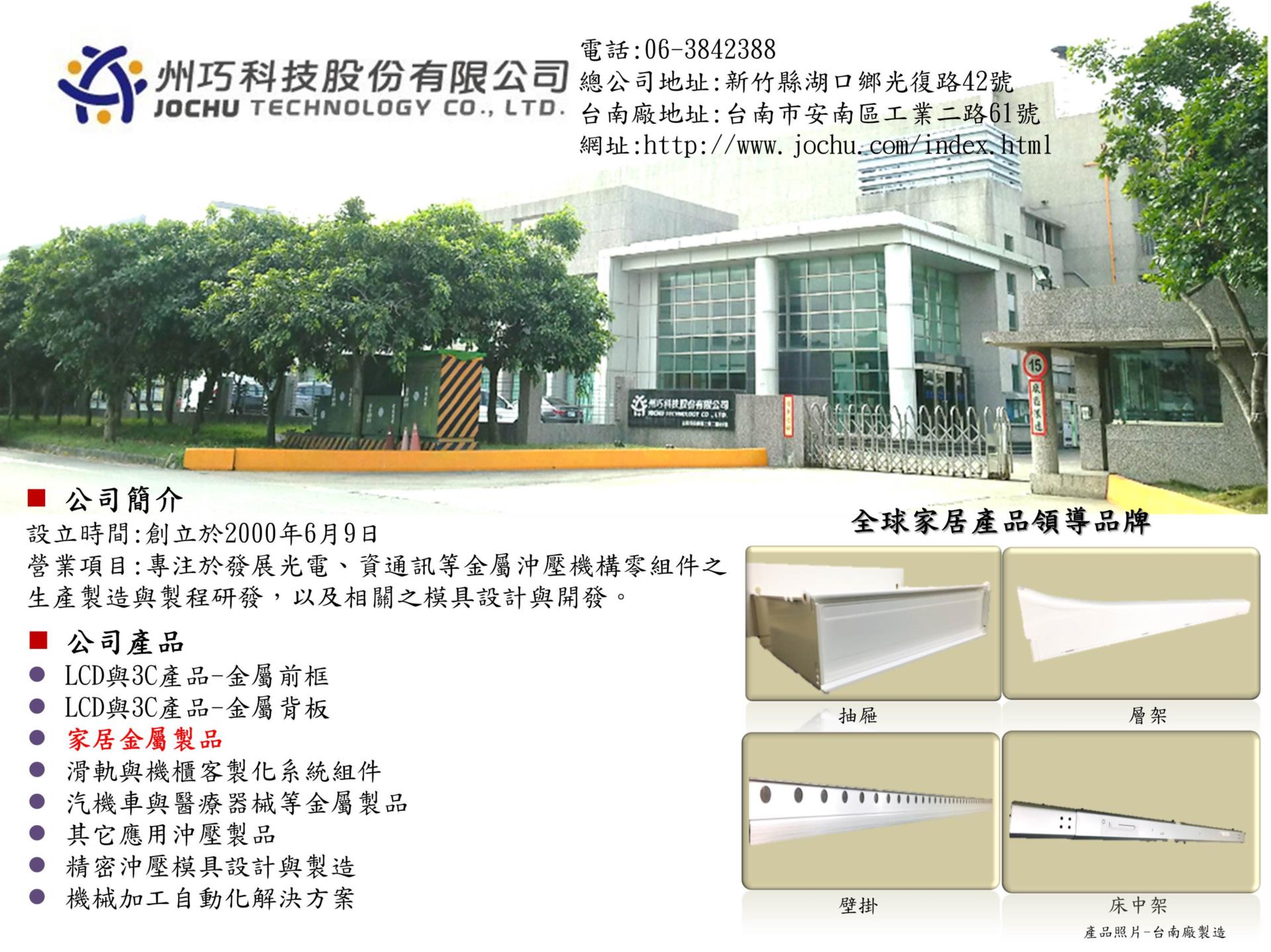州巧科技創立於2000年6月9日,專注於發展光電、資通訊等金屬沖壓機構零組件之生產製造、製程研發及模具的設計開發。初期,在政府的兩兆雙星政策支持下,快速的發展;之後,透過雷射創新技術,得到客戶的支持,隨之快速成長,成為國內TFT光電產業沖壓零組件的一線大廠。
