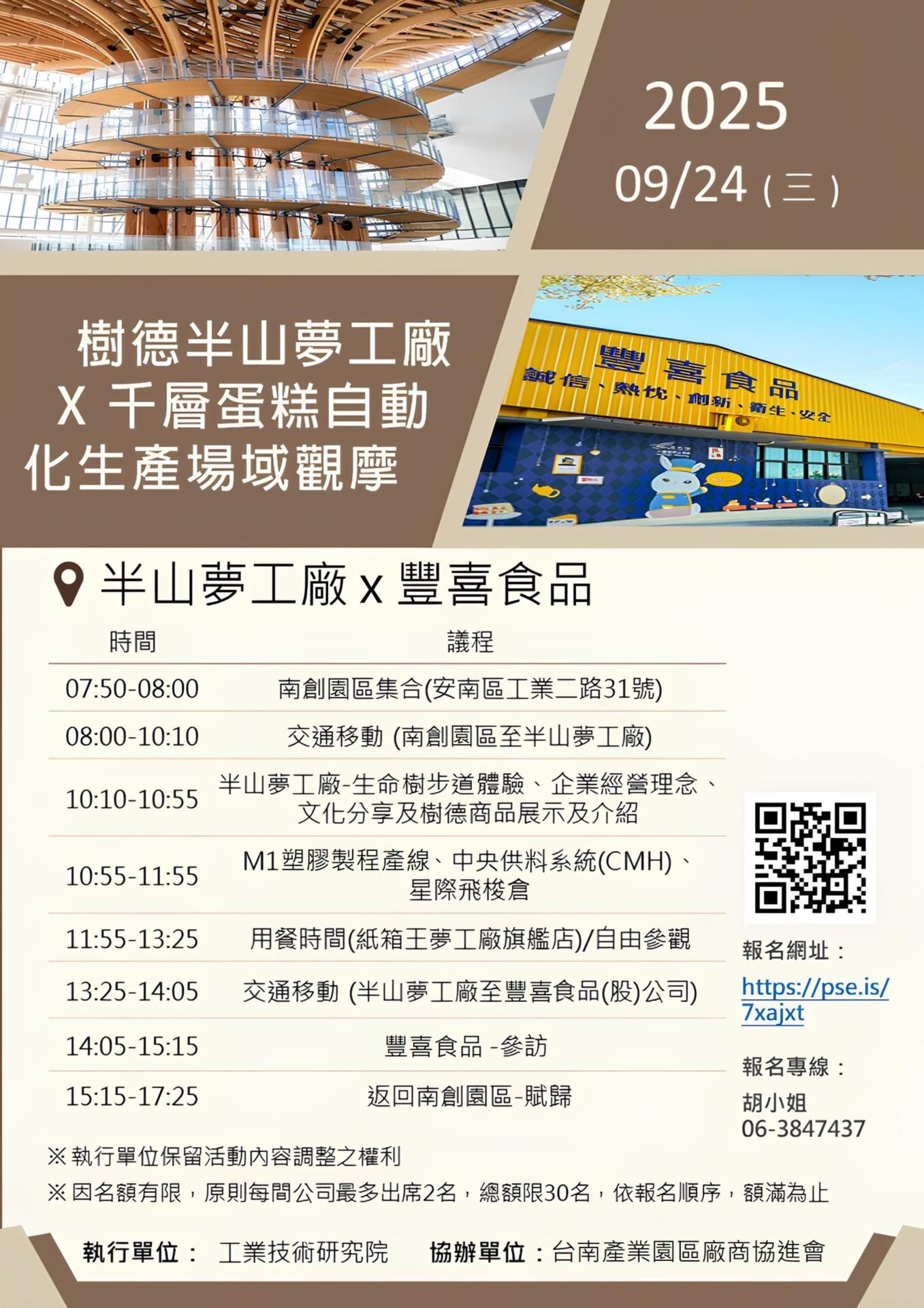 為協助園區企業掌握自動化製造與智慧物流新趨勢,本會協辦【樹德半山夢工廠 × 豐喜食品】觀摩活動,誠摯邀請貴公司參與本次參訪行程,深入一探品牌文化經營、塑膠製程技術、中央供料與自動化甜點生產流程,從中汲取轉型升級的實務經驗。