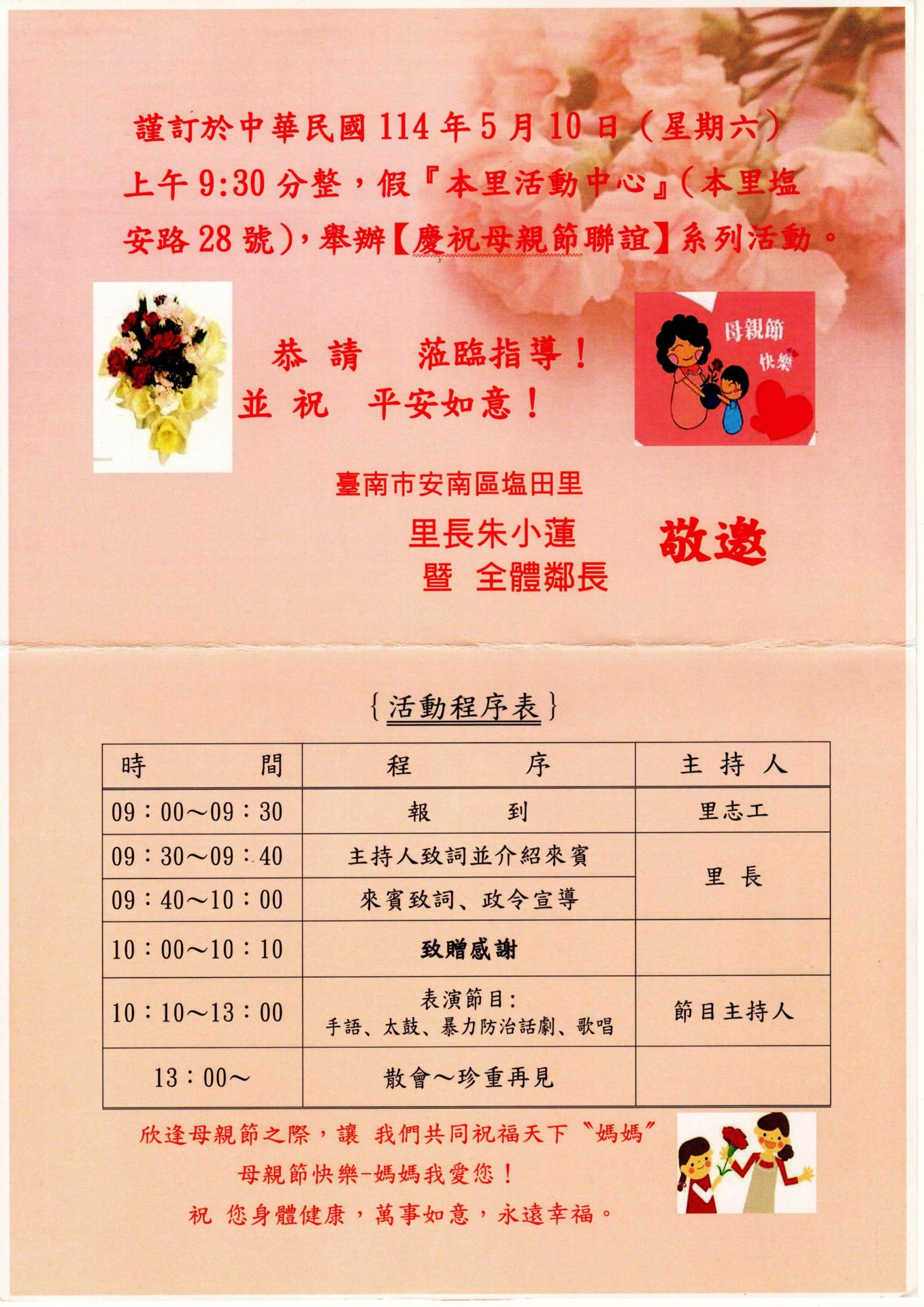 【廠協會敦親睦鄰通知】:114.05.10 塩田里辦公處舉辦「114年慶祝母親節聯誼活動」