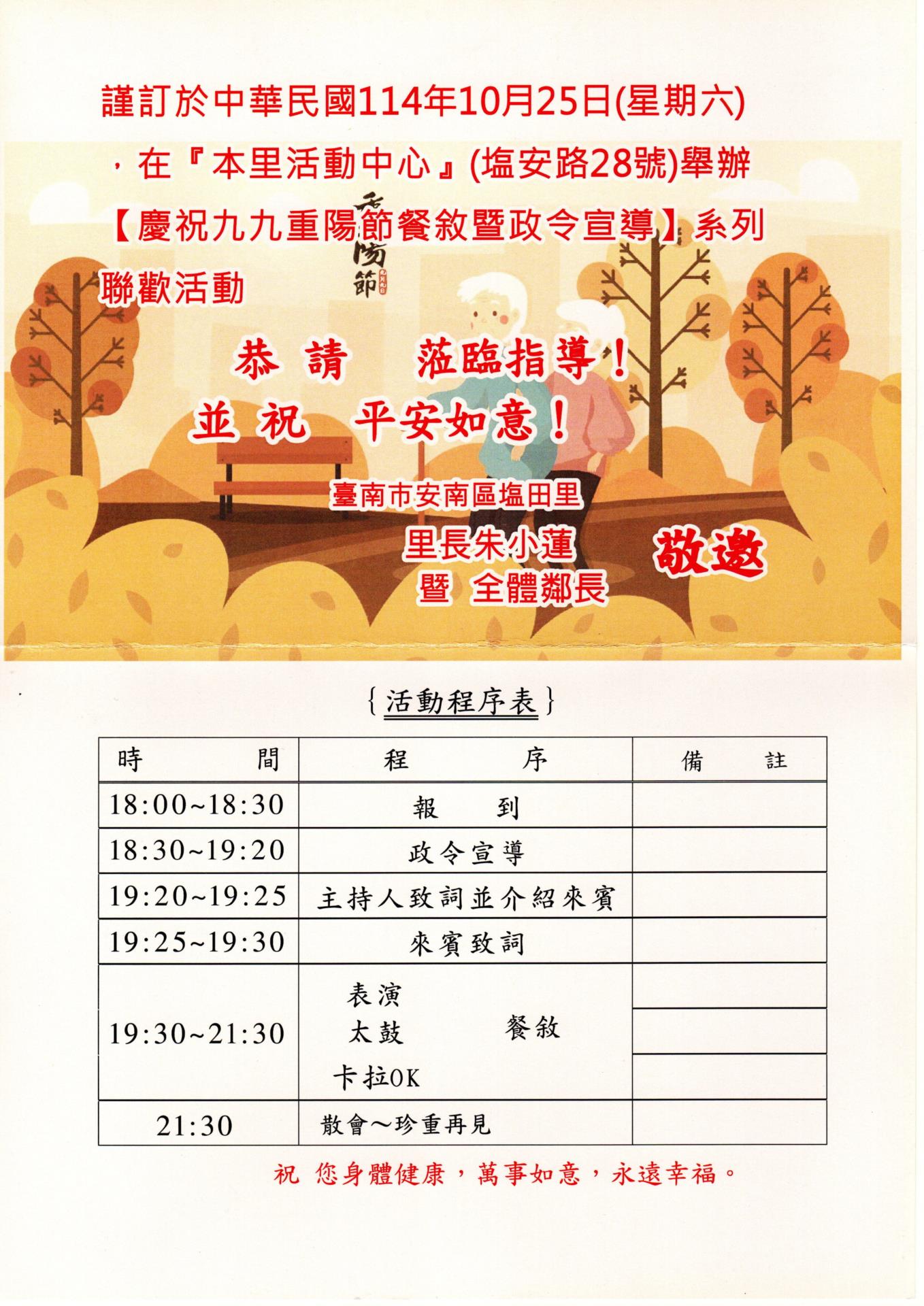 【廠協會敦親睦鄰通知】114.10.29 塩田里舉辦「慶祝九九重陽節暨政令宣導」