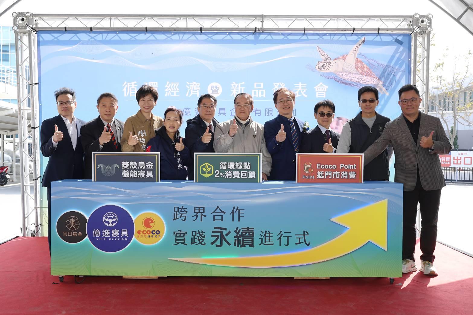 葉理事長暨吳副理事長、經昌萬協理參加「億進新品發表暨循環經濟記者會」本會致贈花柱祝賀。